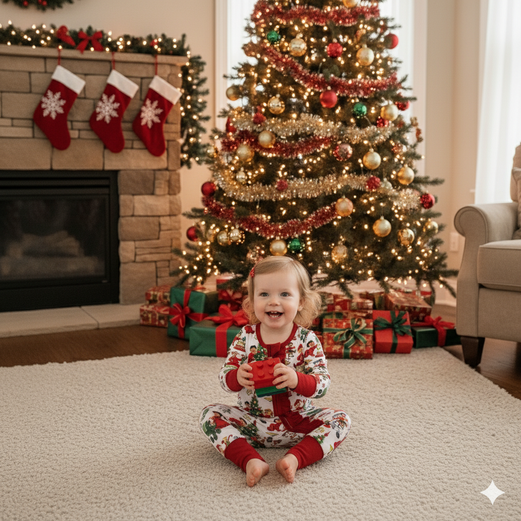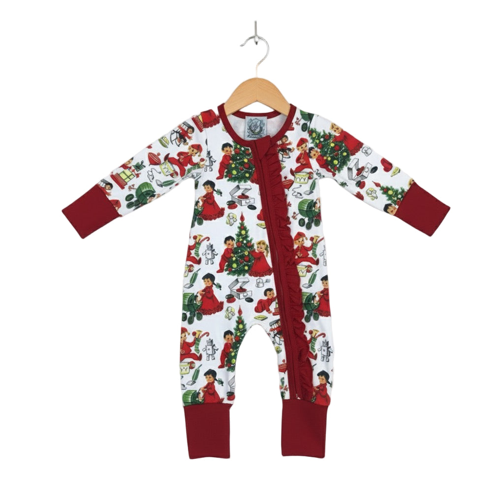 Cozy and festive, this girls’ zippy is perfect for holiday fun and Christmas morning magic! Featuring an adorable print of little girls with vintage Christmas toys, it includes fold-over hand and foot covers for extra warmth. The three rows of ruffles on the back add the sweetest touch of holiday charm. Made from 95% cotton and 5% spandex, this zippy is soft, stretchy, and comfy—perfect for celebrating the season in style!