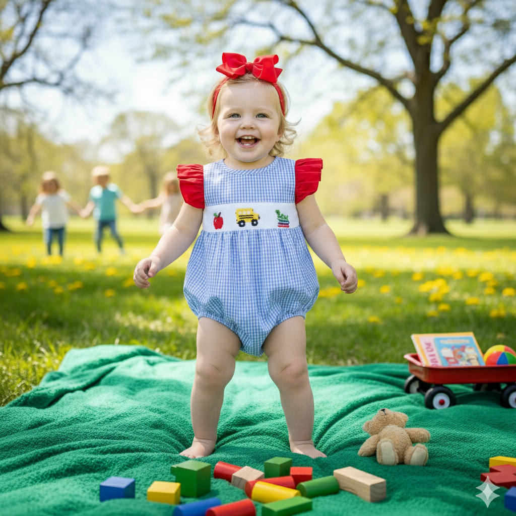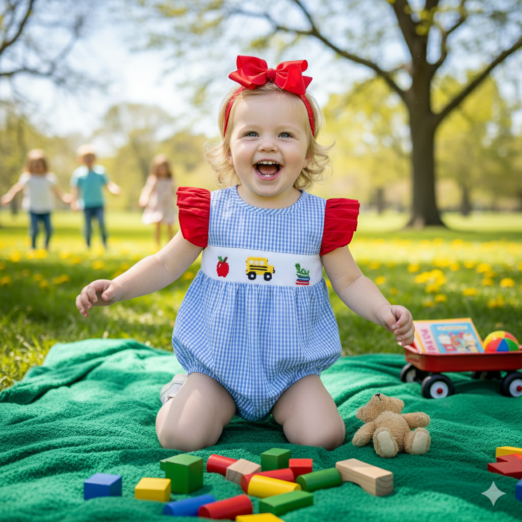 Get your little one ready for school-time cuteness with this charming back-to-school smocked bubble romper! Made from a soft and breathable blue gingham cotton fabric, this romper features playful red flutter sleeves for an extra pop of color. The hand-smocked panel across the chest showcases delightful embroidered motifs of a red apple, a yellow school bus, and a stack of colorful books with a green worm—perfect symbols of learning and fun. Designed with comfort and convenience in mind, the romper includes elastic leg openings and back button closure for easy changes. Ideal for first-day photos, school events, or everyday play!