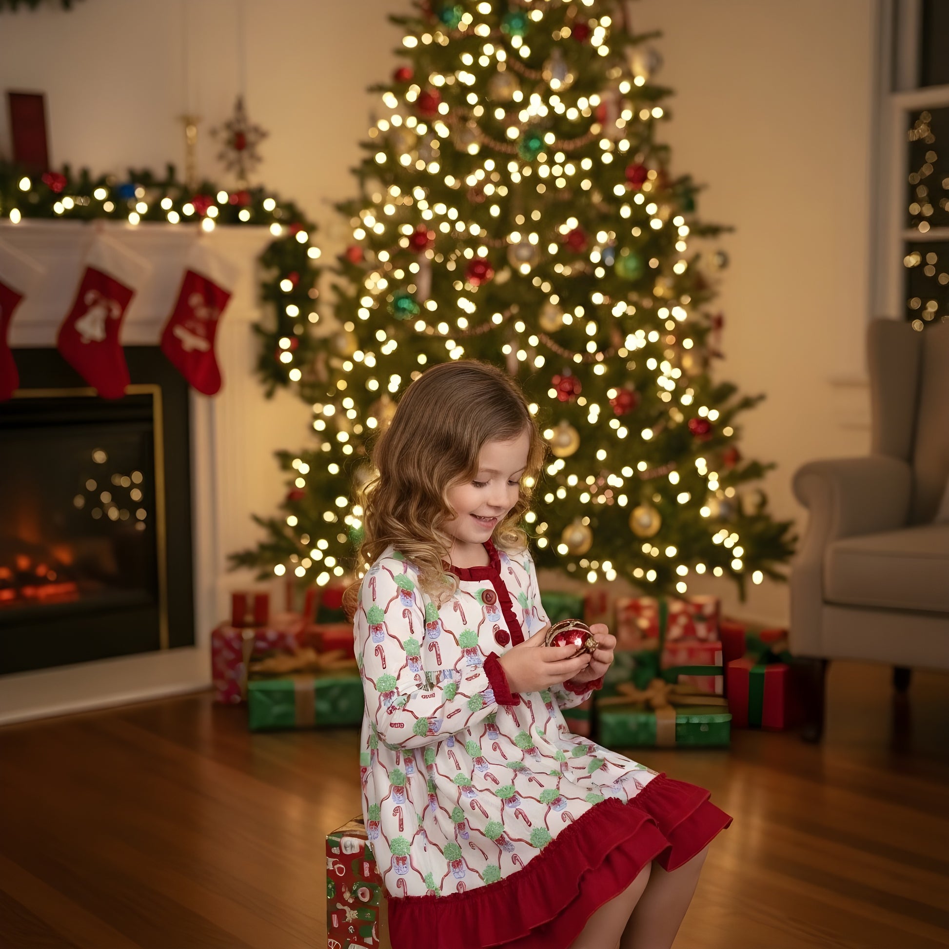 This adorable holiday dress is perfect for festive celebrations! It features a charming print of candy canes and greenery in holiday pots on a cream background. The dress includes a ruffled neckline, button placket, long sleeves with ruffle cuffs, and a tiered red ruffle hem for extra twirl-worthy style. Made of 95% cotton and 5% spandex, it’s soft, stretchy, and comfortable—ideal for holiday photos, parties, and cozy seasonal fun.
