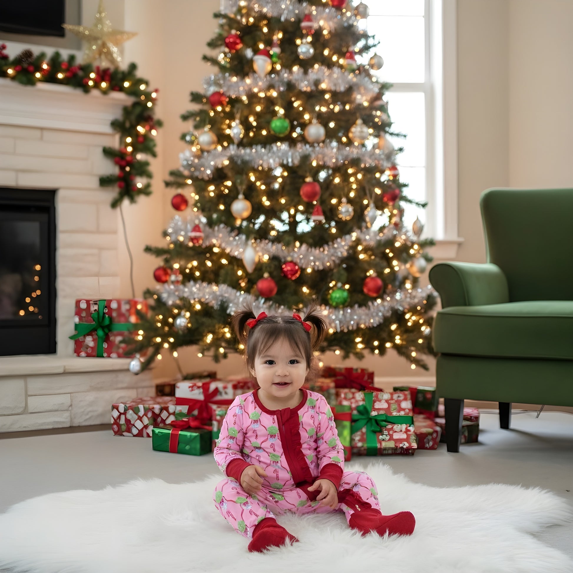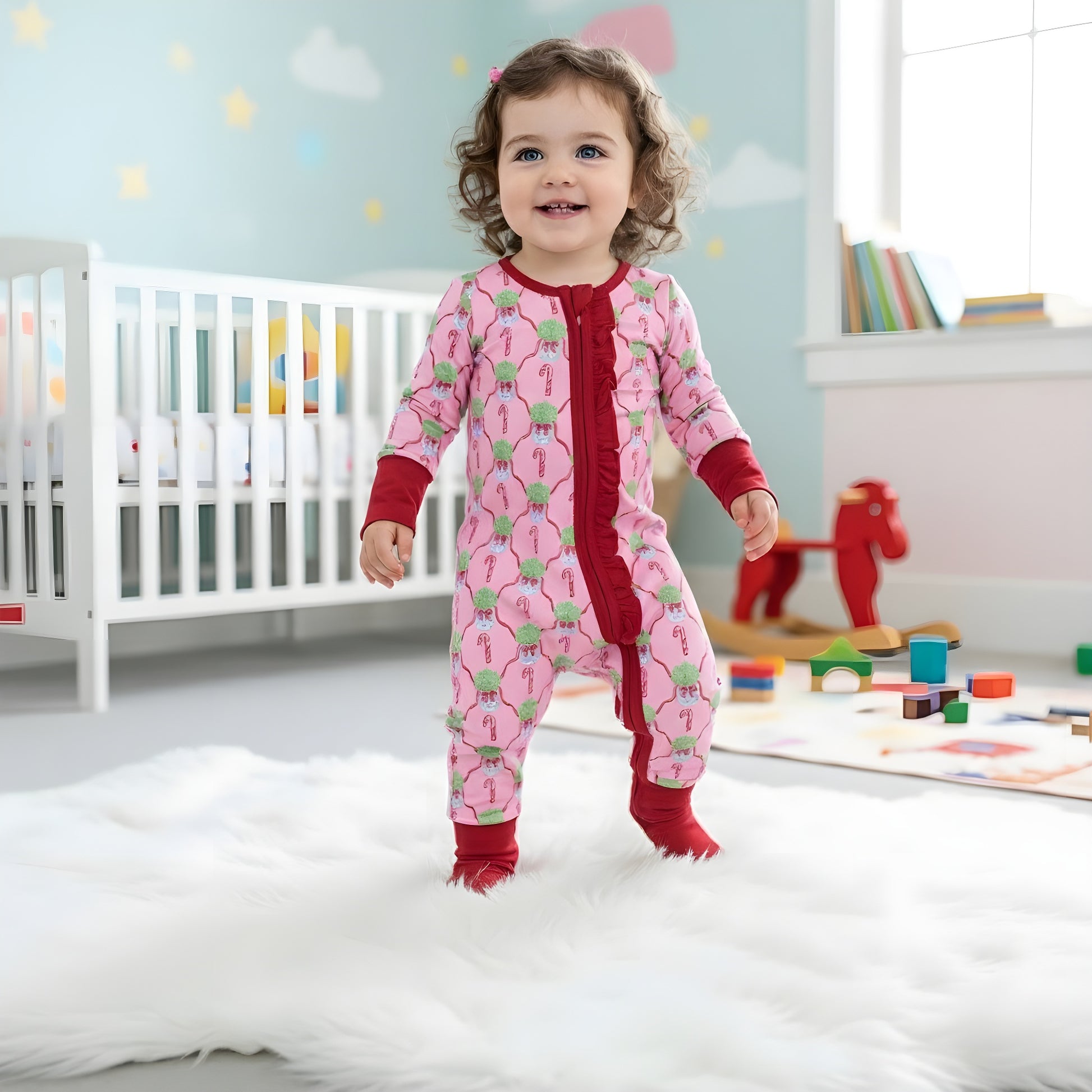 This festive girl’s zippy features a cheerful holiday print of candy canes and greenery tied with red bows on a pink background. Made from 95% cotton and 5% spandex, it offers a soft, stretchy fit for comfort and movement. Hidden hand and foot covers add convenience, while three rows of ruffle butt on the back create an extra-sweet touch. Perfect for holiday celebrations or cozy nights, this zippy blends style, comfort, and festive charm.