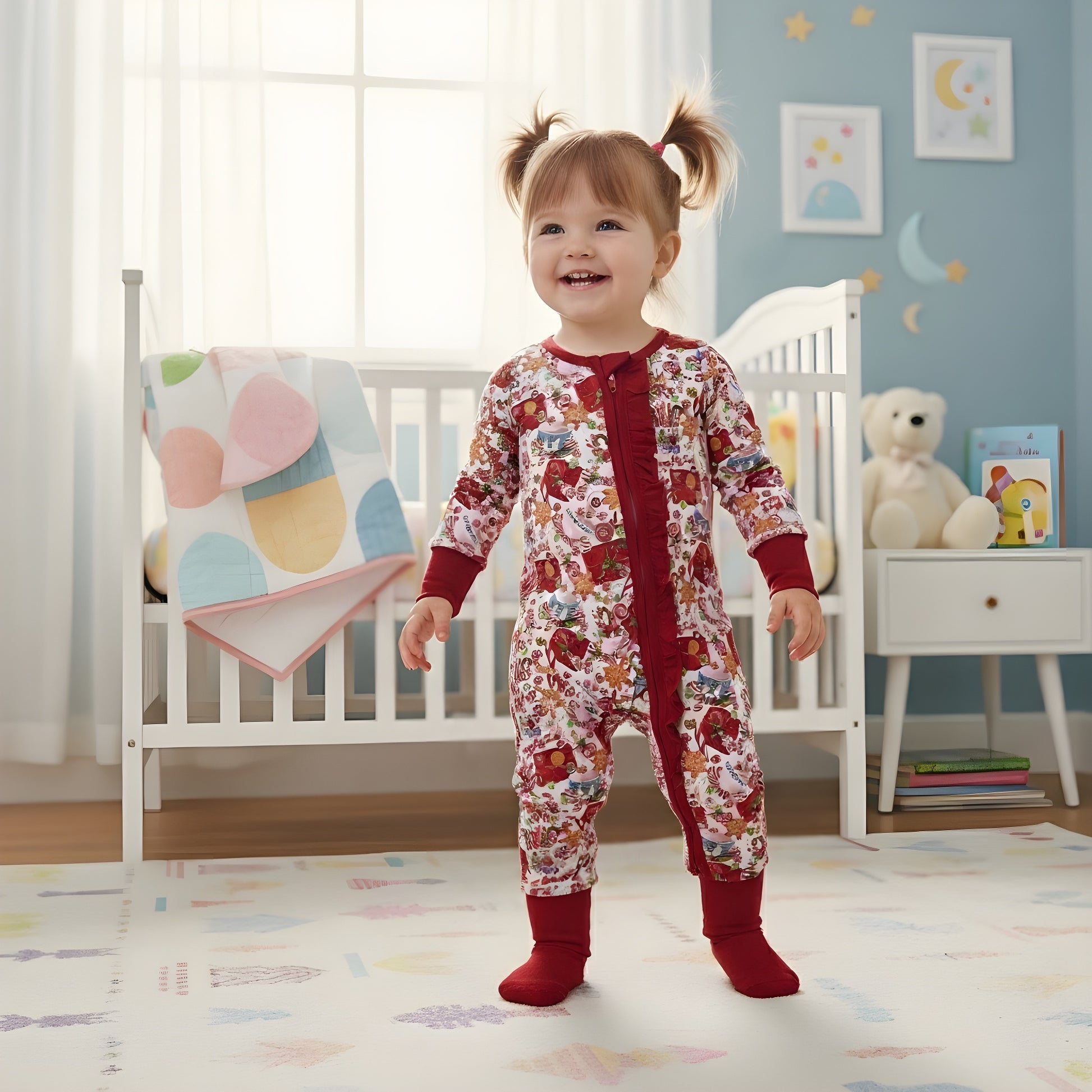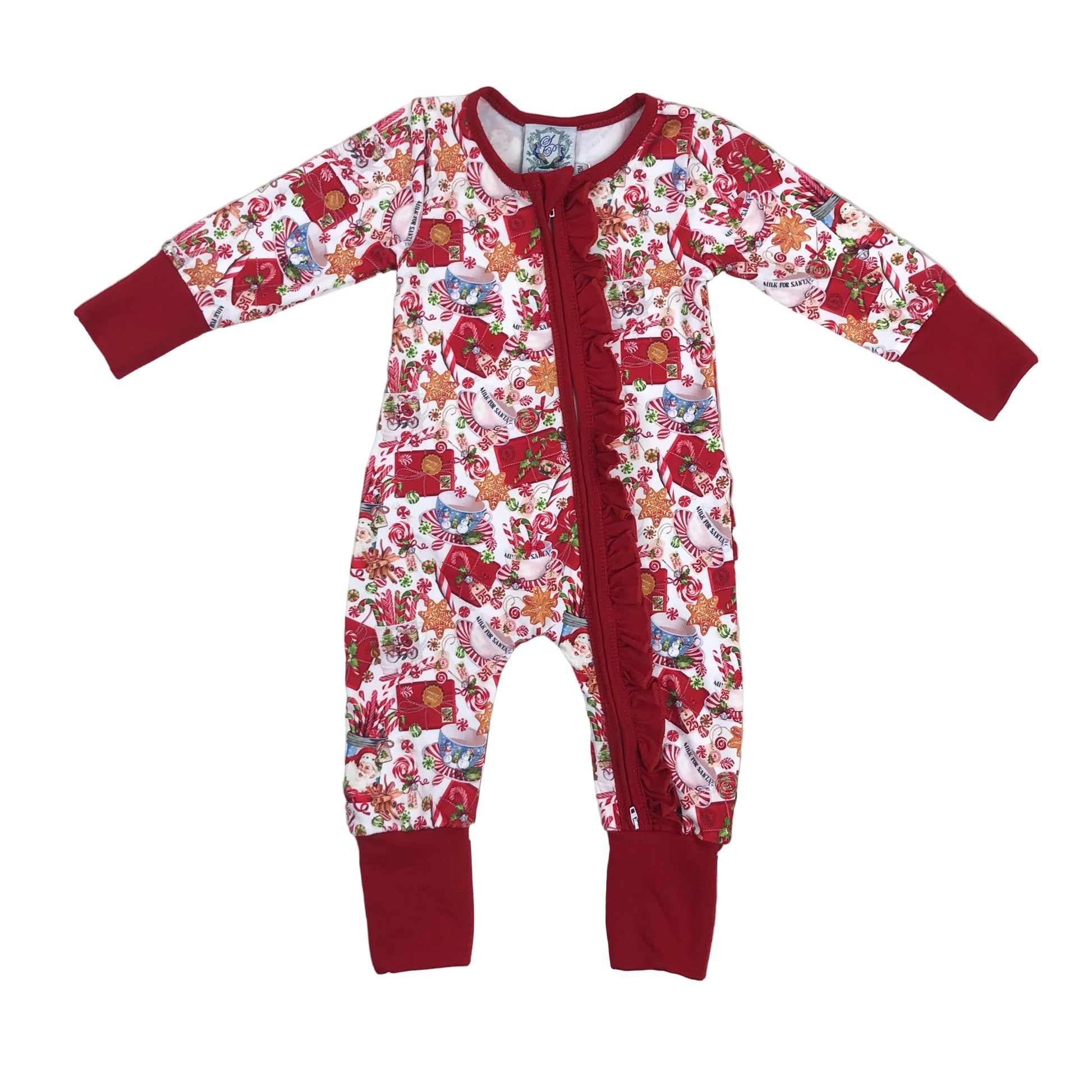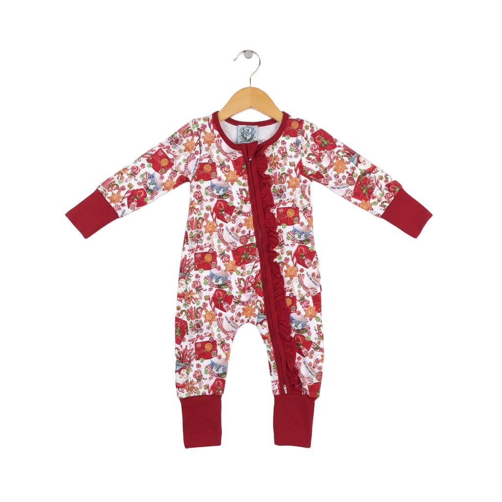 This festive girl’s zippy features a lively holiday print filled with candy canes, gingerbread cookies, stockings, and ornaments. Made from 95% cotton and 5% spandex, it offers a soft, stretchy fit for all-day comfort. Hidden hand and foot covers add convenience, while three rows of ruffle butt on the back bring extra charm. Perfect for holiday celebrations or cozy nights, this zippy combines comfort, style, and festive cheer for your little one.