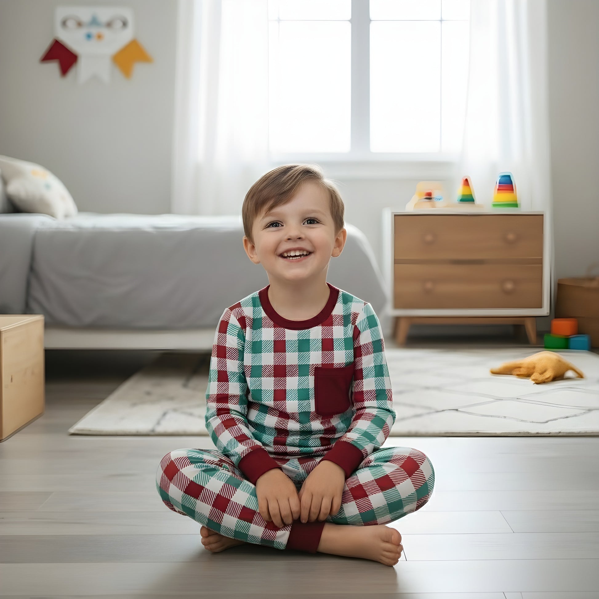 Get your little one ready for bed in style with this adorable Christmas Red and Green Gingham Pajama Set. Made from soft, breathable cotton, these pajamas offer ultimate comfort for a peaceful night's sleep or a cozy day of play. The classic red and green gingham pattern is perfect for the holiday season, adding a festive touch to their wardrobe.