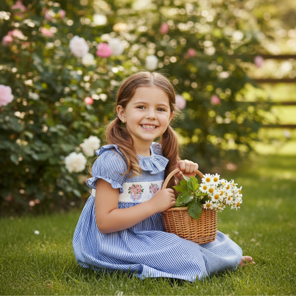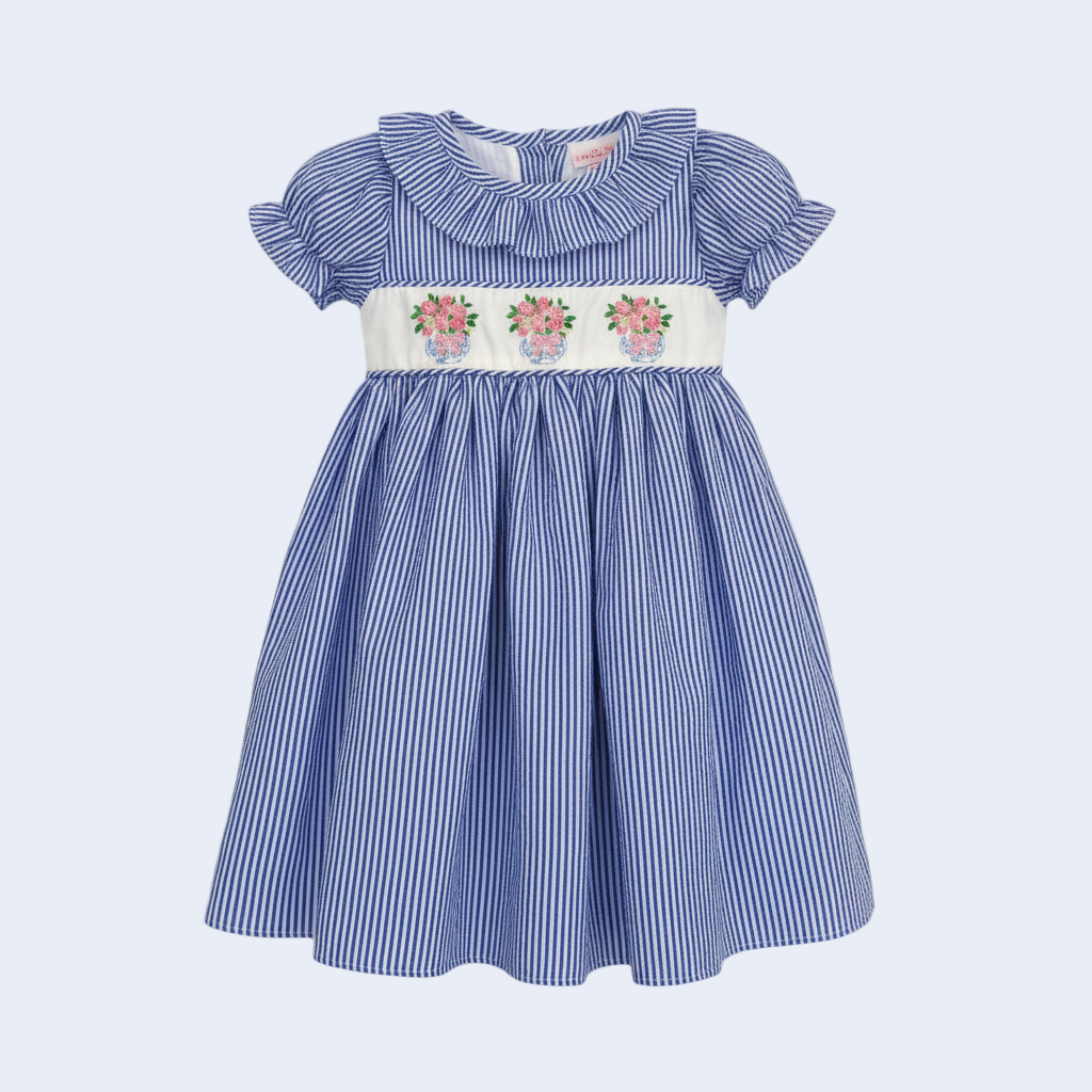 Delicate charm meets classic southern style in our Blue Stripe Floral Teacup Smocked Dress. Featuring graceful blue vertical stripes and exquisite hand-smocked embroidery of blooming pink flowers nestled in dainty teacups, this dress is a picture of polished sweetness.
