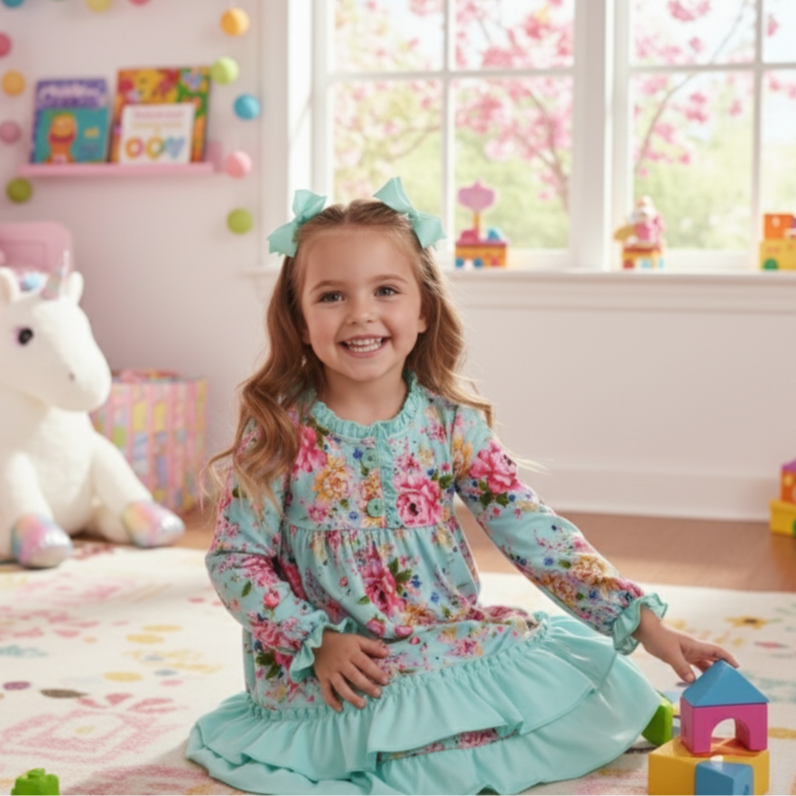 Tuck your little one in with comfort and charm in our Mint Blossom Ruffle Nightgown. With its dreamy floral print and soft mint background, this nightgown turns bedtime into a garden of sweet dreams. Designed with gentle ruffles at the neckline, cuffs, and hem, it blends classic elegance with cozy functionality.