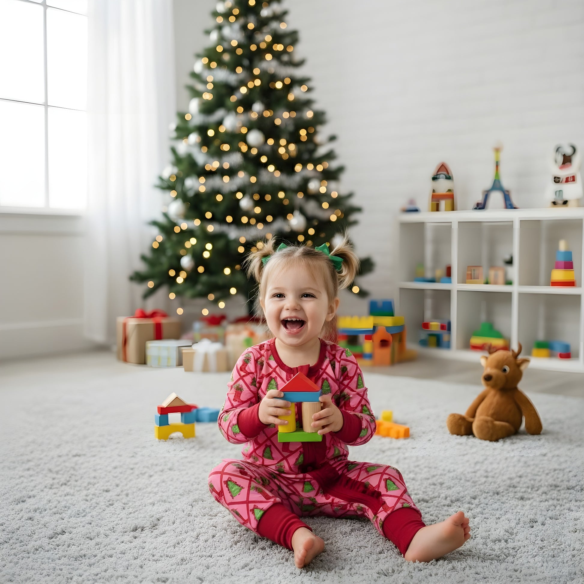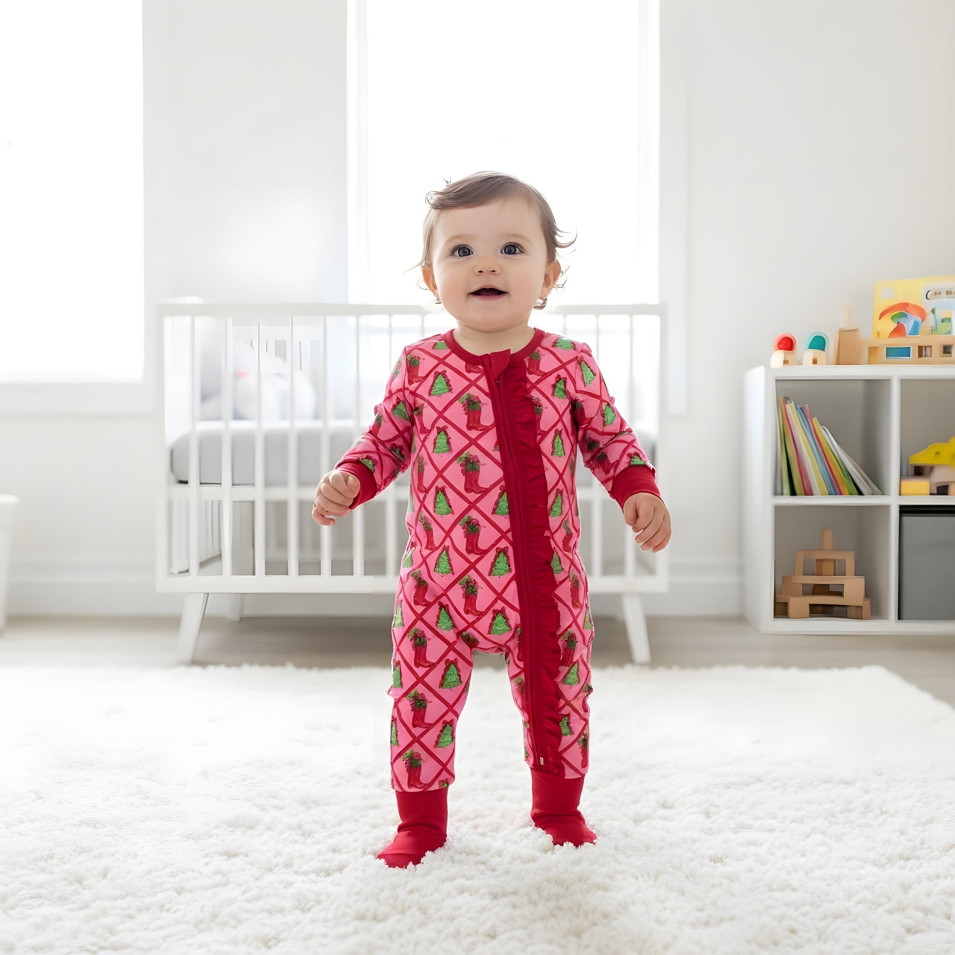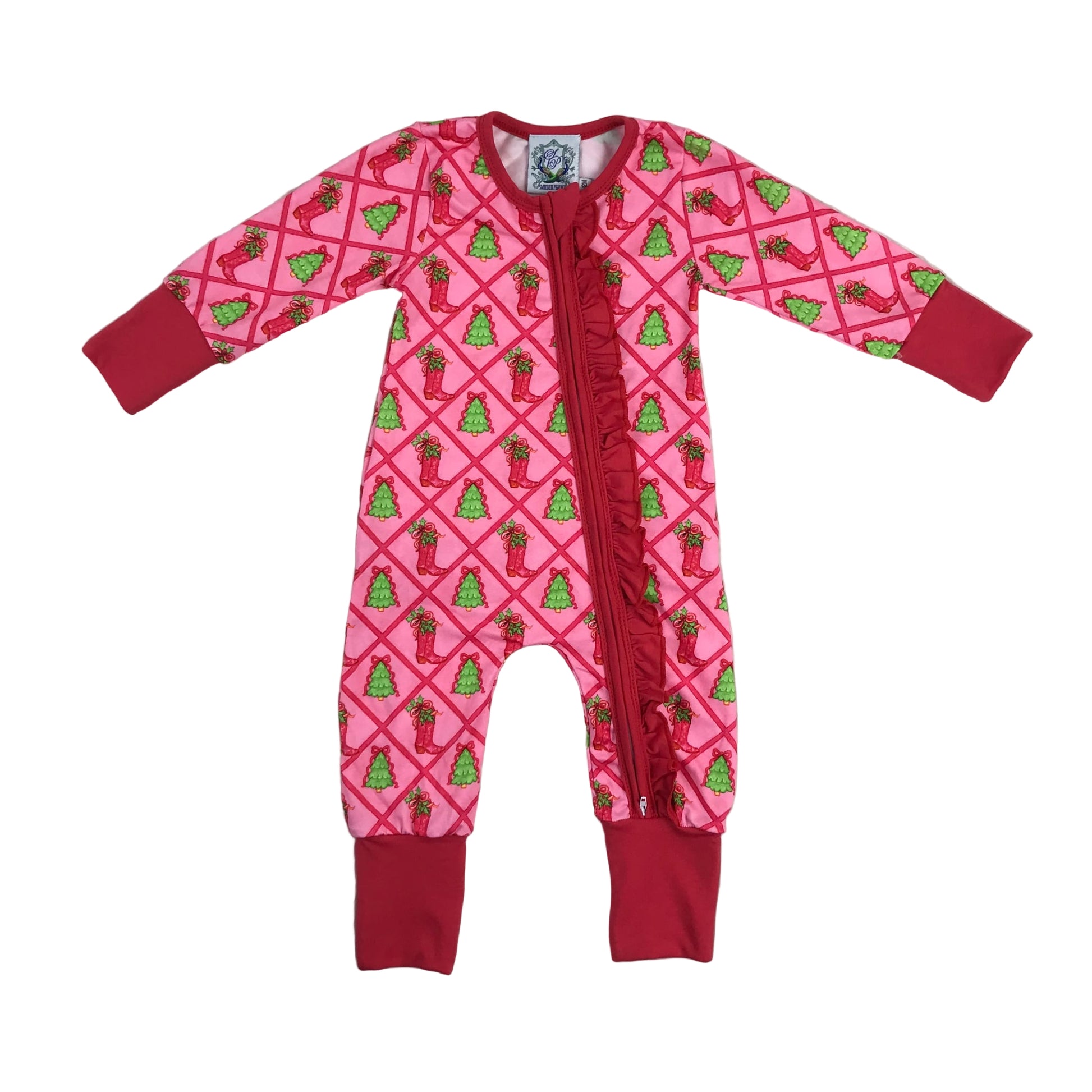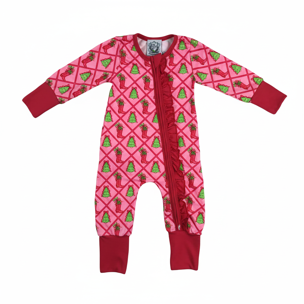This festive baby zippy is made from a cozy blend of 95% cotton and 5% spandex, perfect for comfort and stretch during the holidays. The adorable pink design features Christmas trees and cowgirl boots, accented by a sweet ruffle detail along the zipper. It includes hidden hand mittens and foot covers for extra convenience. On the back, three rows of ruffles add an extra touch of charm, making it as cute as it is practical for your little one.