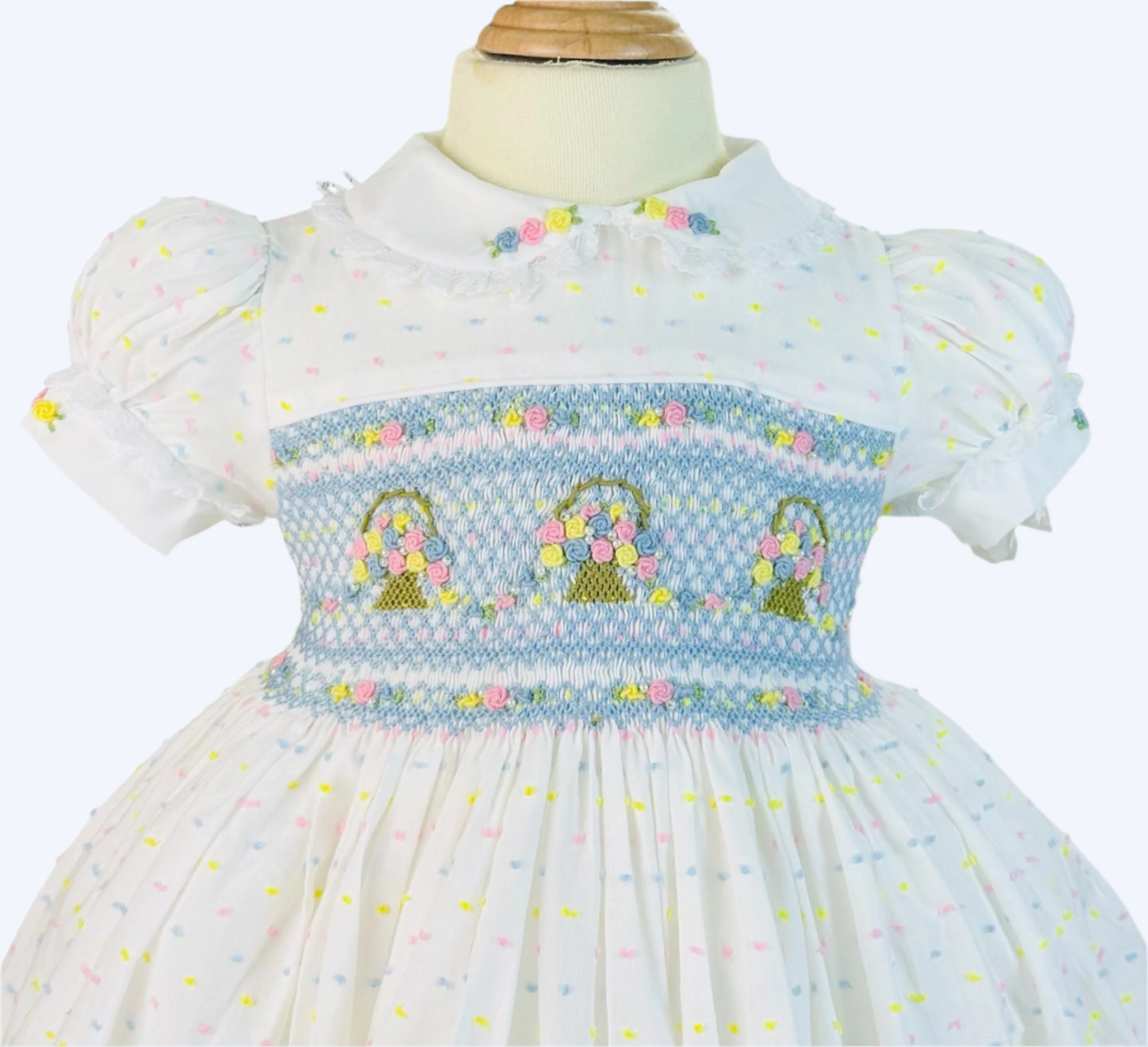 Delicate, dreamy, and steeped in tradition, our Pastel Petals Hand-Smocked Heirloom Dress is a beautiful expression of springtime sweetness. Crafted from airy white fabric with soft embroidered pastel dots, this timeless dress features a hand-smocked bodice adorned with floral baskets, scalloped detailing, and dainty ribbon roses in soft shades of pink, yellow, lavender, and blue.