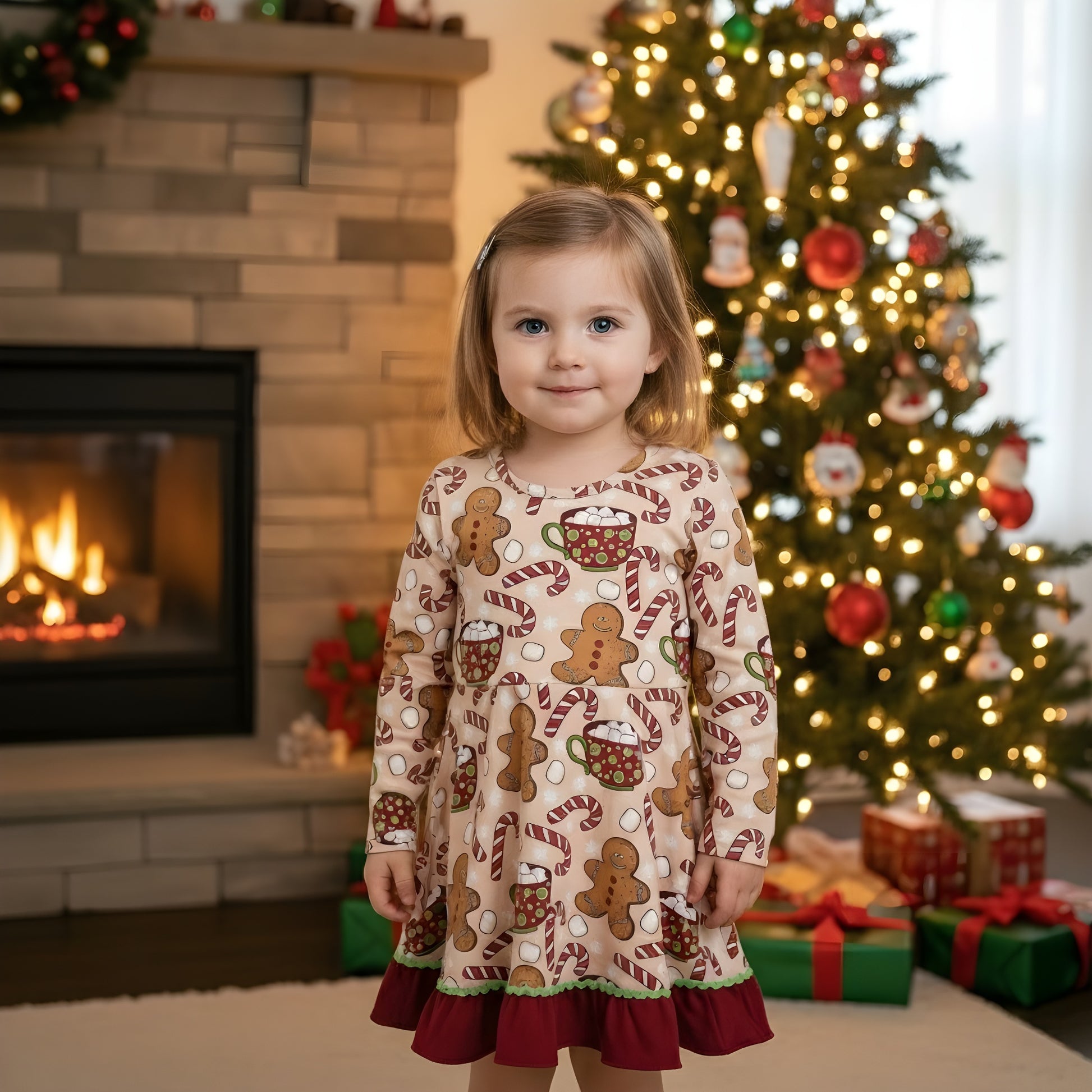 This festive holiday dress is full of Christmas cheer! Featuring a playful print of gingerbread cookies, candy canes, and mugs of hot cocoa on a soft cream background, it’s perfect for seasonal celebrations. The dress has a twirl-worthy skirt trimmed with bright red ruffles and a touch of green ric-rac for extra holiday flair. Made of 95% cotton and 5% spandex, it’s soft, stretchy, and comfortable for holiday photos, parties, and cozy winter fun.