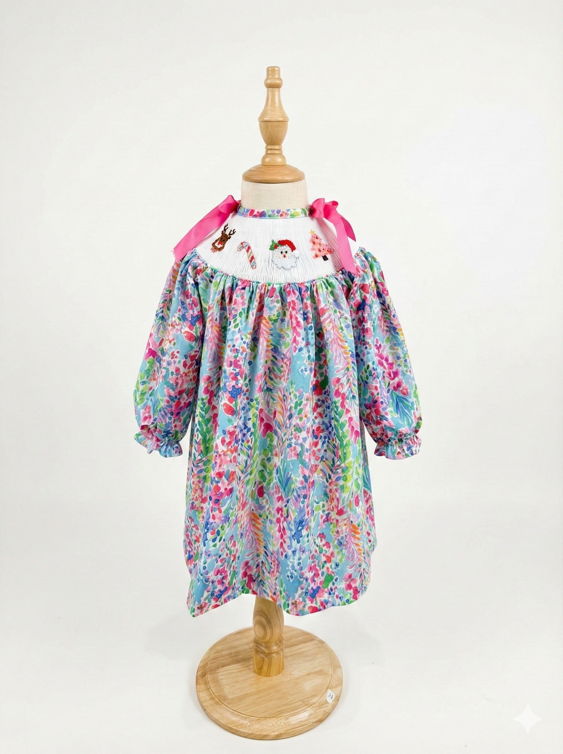 Girls Hand Smocked Hand Embroidered Tropical Palm Beach Santa Dress