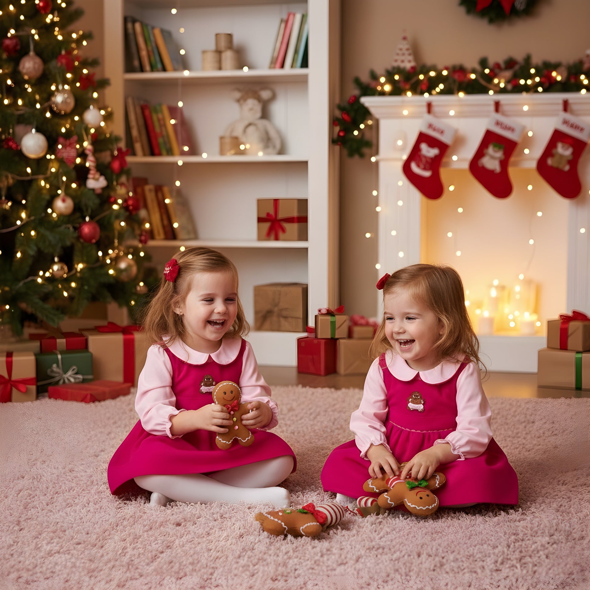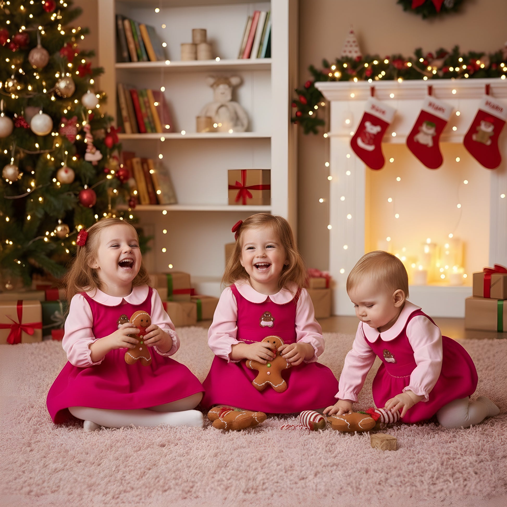 The outer garment is made from soft, warm fuchsia corduroy fabric and features a full, gathered skirt. The bodice is adorned with an adorable embroidered gingerbread lady on a small white plaque. The set is layered over a light pink long-sleeved cotton blouse with gentle ruffles at the cuffs and a sweet, rounded pink collar. Completing the outfit are matching light pink knit cotton bloomers/diaper cover with ruffled edges, ensuring a comfortable fit. This charming and layered corduroy set is perfect for baby’s first holiday photos or keeping them snug during family gatherings.