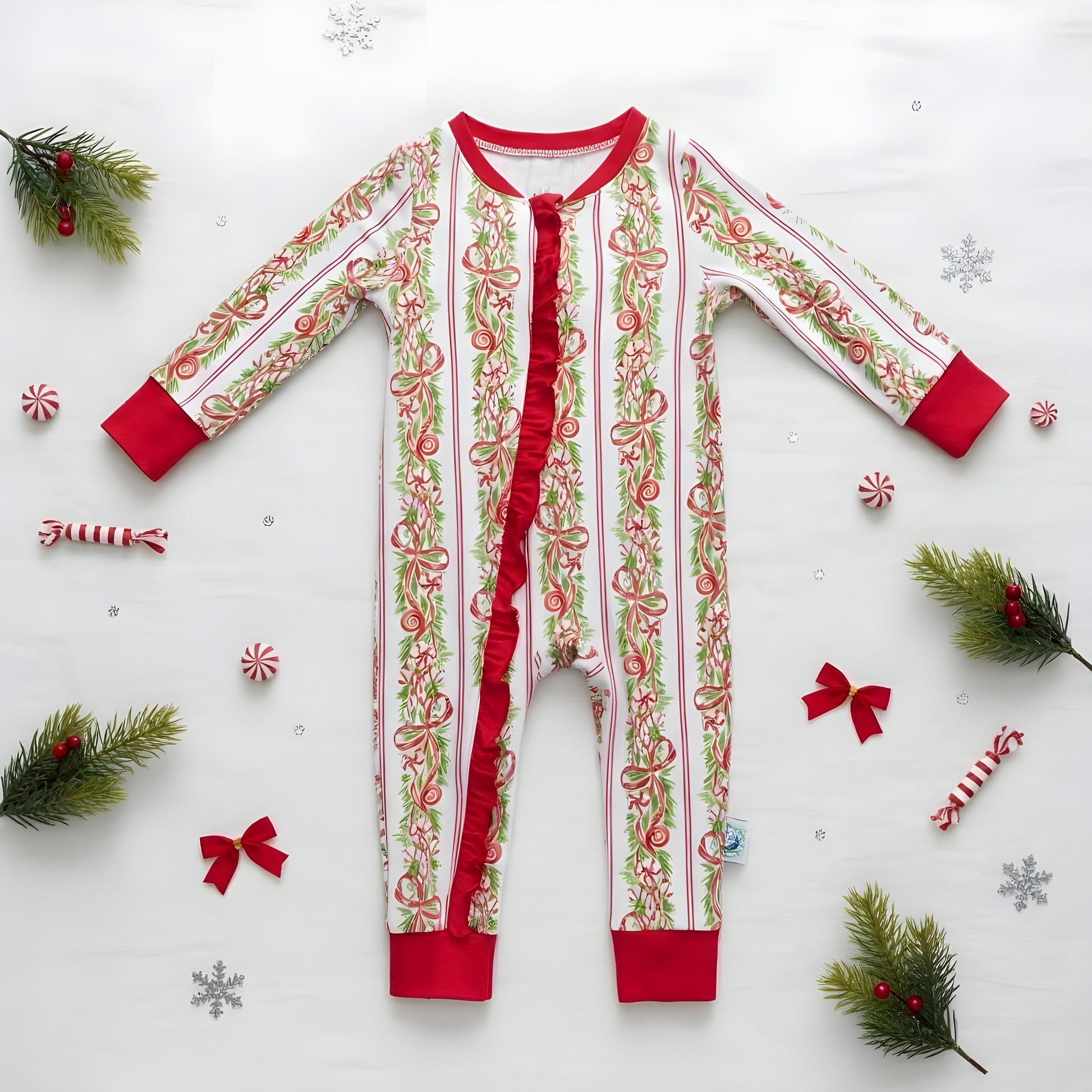 Featuring a timeless holiday print of red and green garland stripes, this zippy is all about the details. A sweet red ruffle lines the convenient zipper for a touch of festive flair, while the matching red cuffs add a cozy finish. It’s the perfect outfit for memorable Christmas morning photos, festive gatherings, or as a cherished holiday gift.