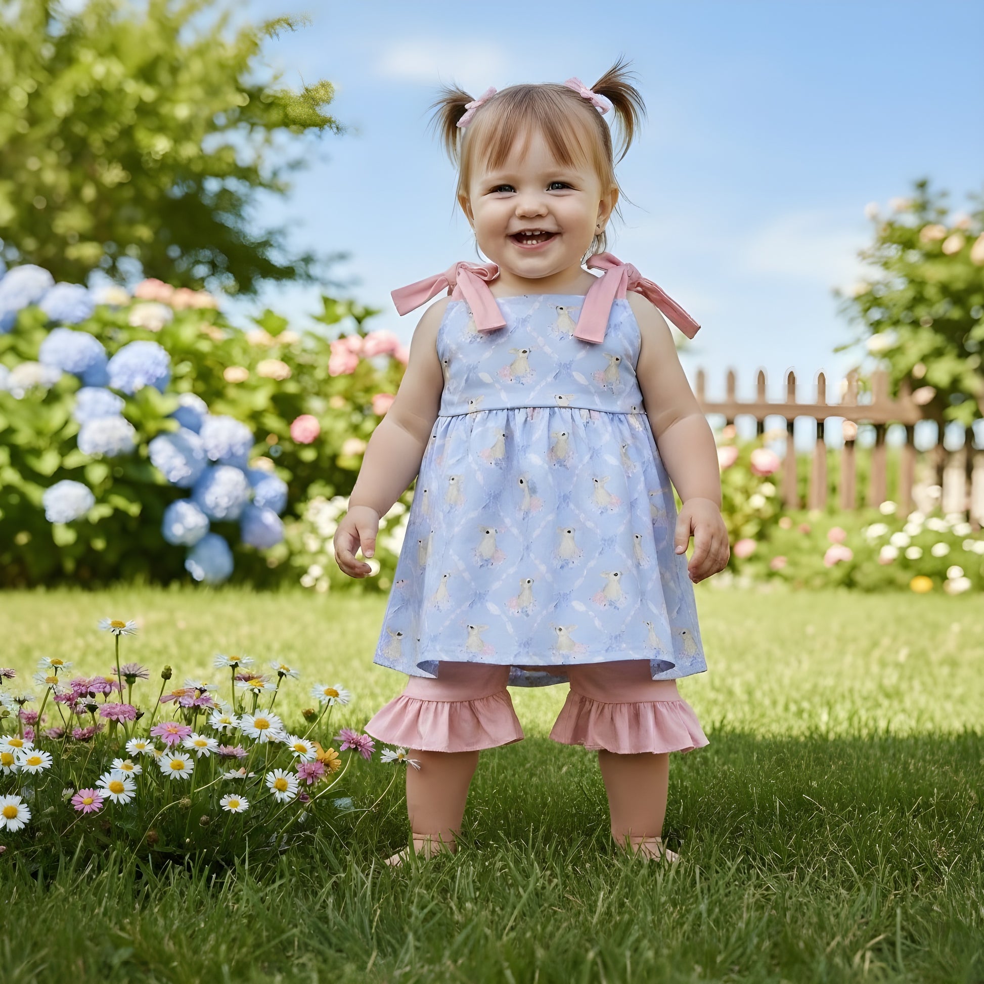 Sweet and playful, this girls’ shorts set is perfect for Easter celebrations and sunny spring days! The sleeveless top features pretty shoulder bows and a charming pastel print, paired with coordinating ruffle-trimmed shorts for an extra touch of cuteness. Made from 95% cotton and 5% spandex, this set offers a soft, breathable, and stretchy fit to keep your little one comfy while looking adorable. A must-have outfit for Easter egg hunts, family photos, and warm-weather adventures!