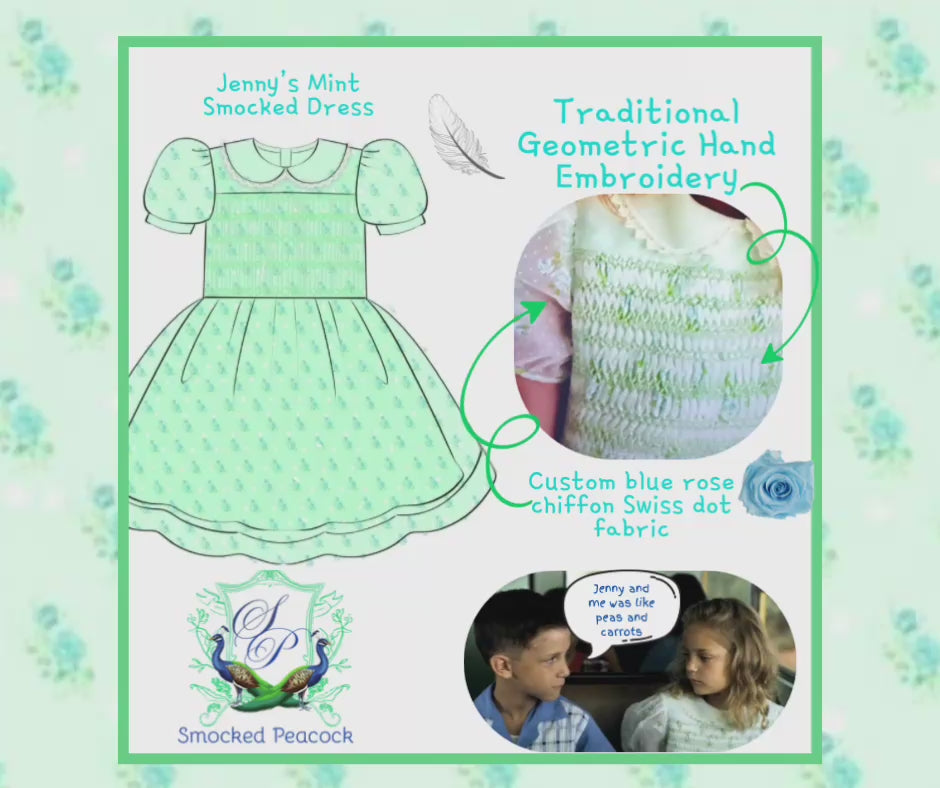 A traditional southern hand smocked - hand embroidered dress - customized chiffon Swiss dot rose fabric adorns the outer layer with the finest woven mint on the inner layer, followed by a 3rd layer of sheer lining. Button closure in the back. This dress is ideal for Sunday School or church. A relic of a bye-gone era brought back to life to be cherished for generations. This one is for your petite keep trunk and to be passed down generations. Heirloom quality and reasonably priced. This started as a personal project as I wanted my daughters to have this dress! After sourcing the custom chiffon fabric with this specific blue rose Swiss dot print - the cost to do so was not reasonable for the fabric quantity required to purchase (customized chiffon fabric). Opening this as a pre-order is the only way I could have these made for my daughters as I wanted to match Jenny’s dress in the strictest way!!