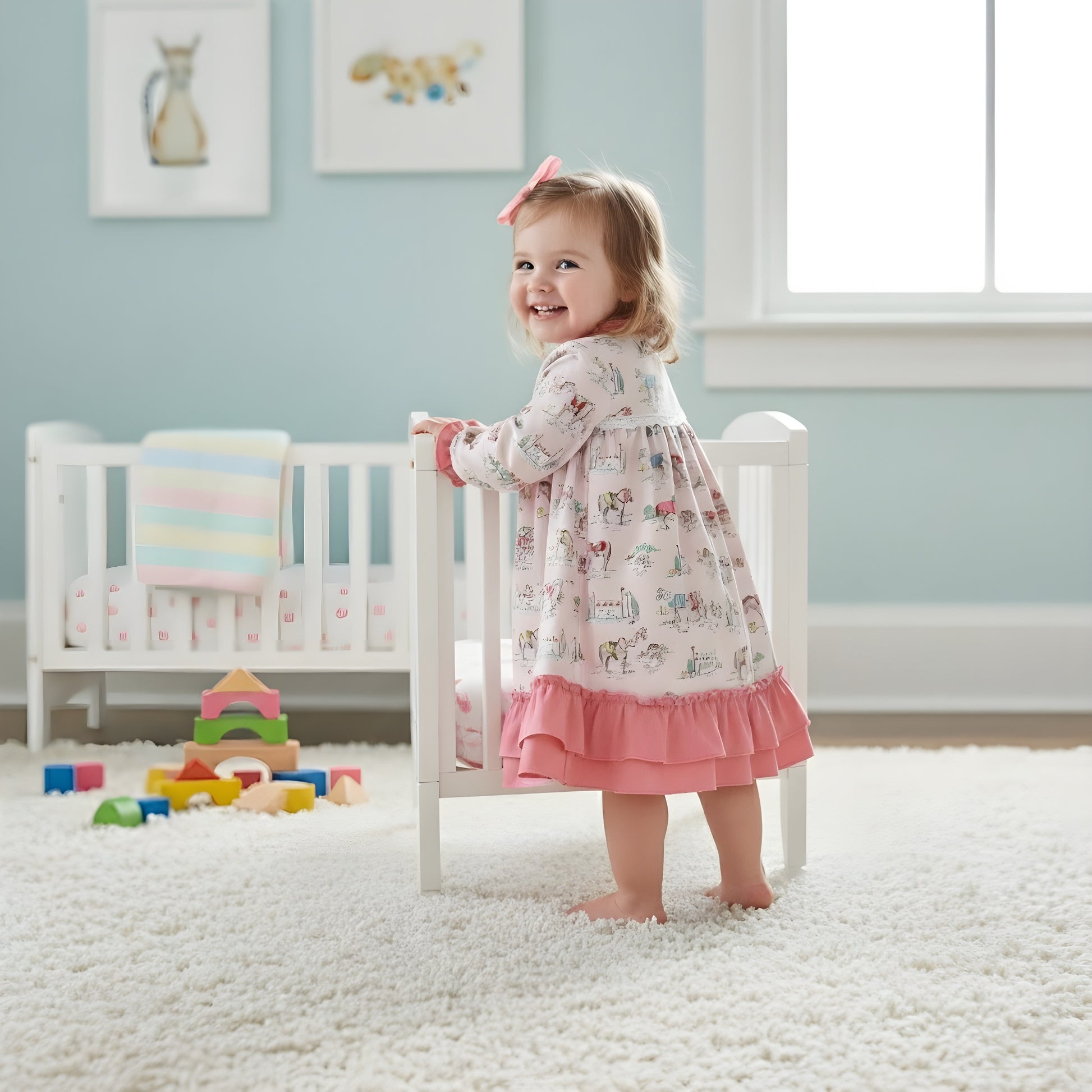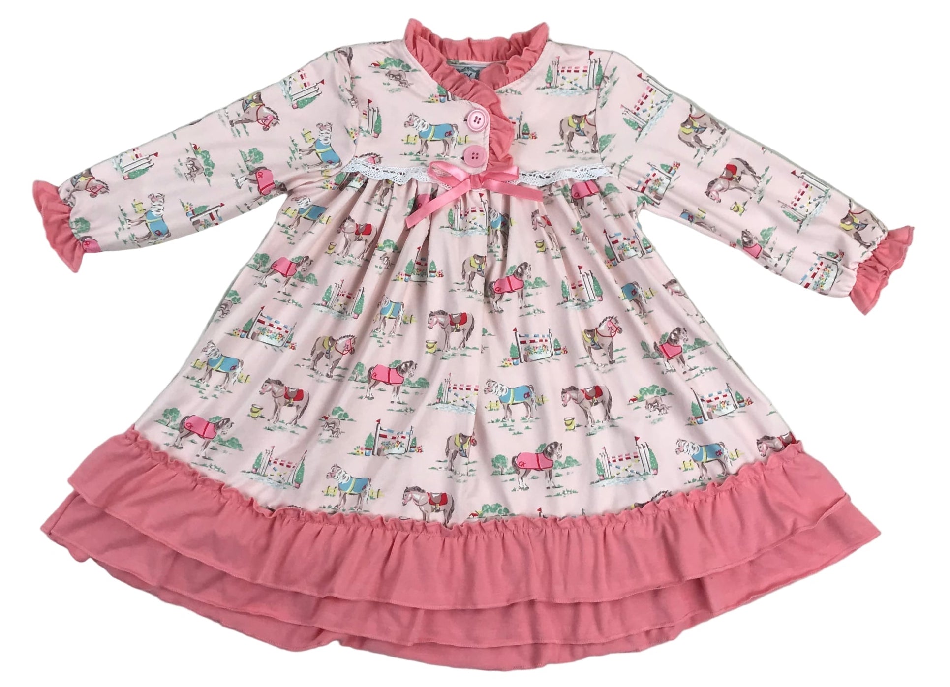 This darling girl’s nightgown is made from a soft and stretchy blend of 95% cotton and 5% spandex, offering cozy comfort for bedtime. The charming design features playful ponies and equestrian details, perfect for horse-loving little ones. A sweet white lace strip with a pink bow across the front chest adds a beautiful touch, while ruffled trim along the collar, sleeves, and hem completes the classic look. It’s an adorable mix of comfort and timeless style.