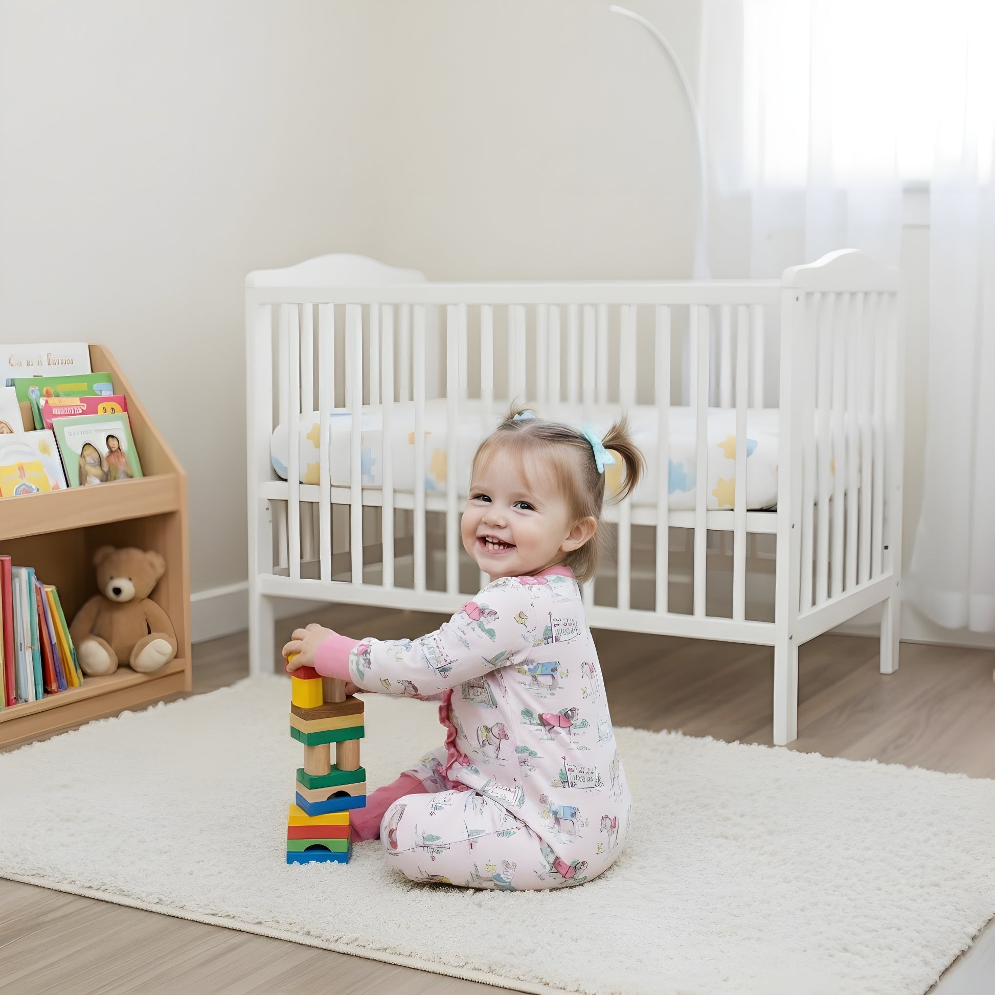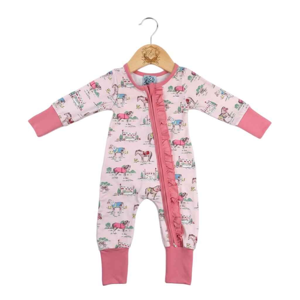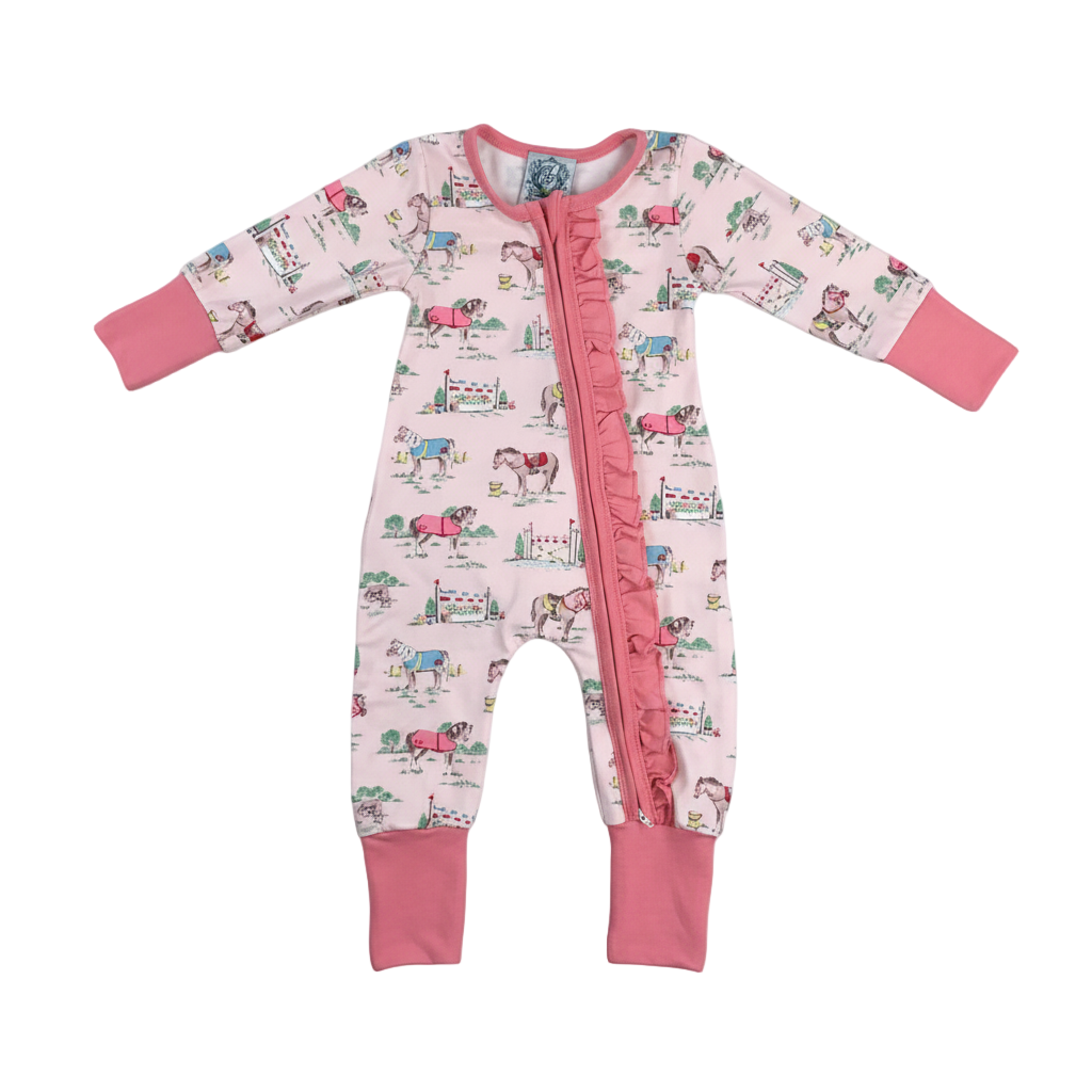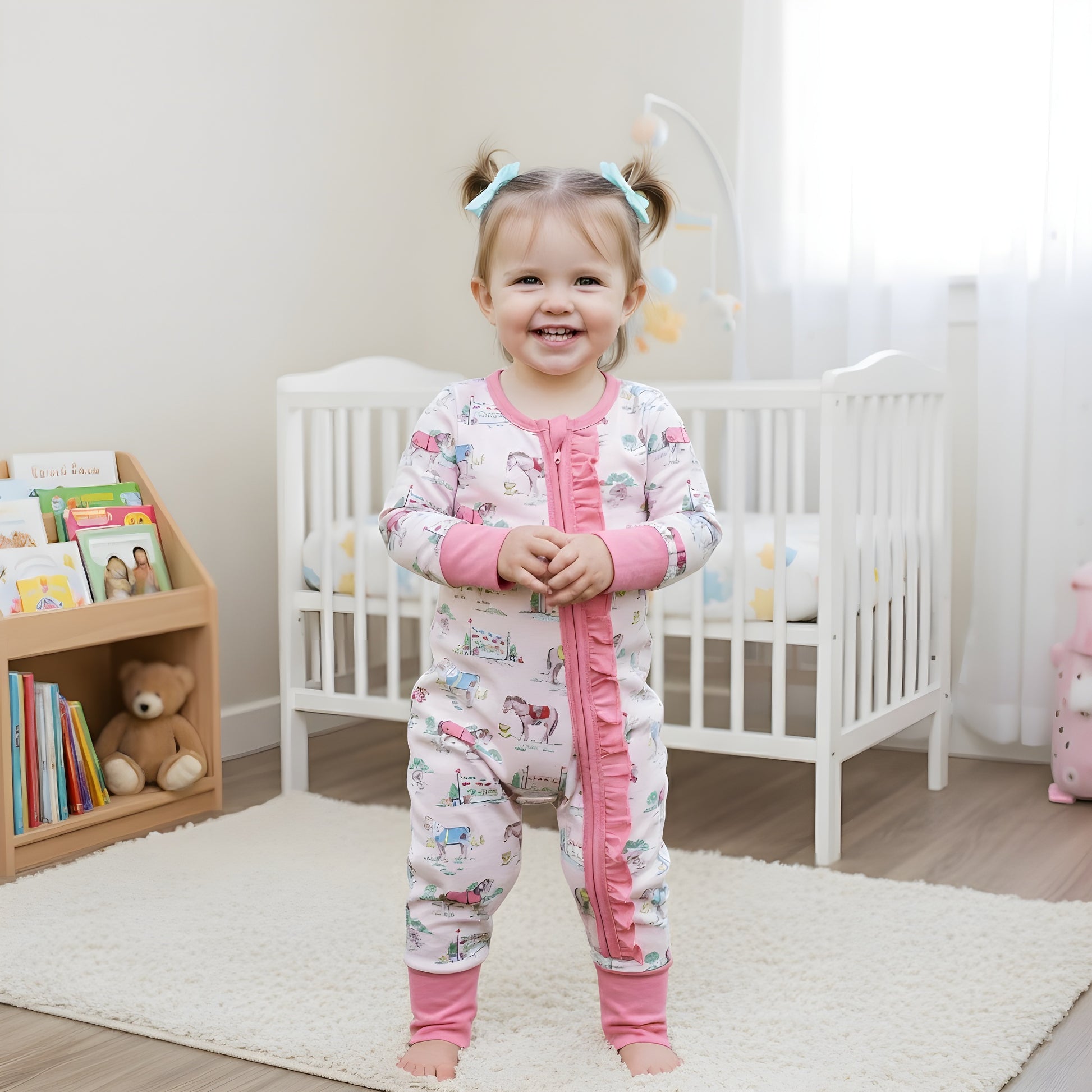 This adorable baby zippy is made from a soft and stretchy blend of 95% cotton and 5% spandex, ensuring comfort and ease of movement. The charming design features playful ponies and equestrian details, perfect for little horse lovers. It includes hidden hand covers and hidden foot covers for extra convenience. On the back, three rows of ruffles add a sweet and stylish touch, making this zippy as practical as it is precious.