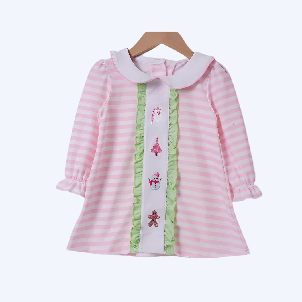 Make the holidays magical with this adorable pink and white striped knit dress, featuring whimsical Christmas embroidery that delights at every glance. From Santa to gingerbread, the hand-threaded designs down the center panel bring festive cheer in every stitch. Made from soft cotton knit, it offers all-day comfort and cozy warmth for cooler days.