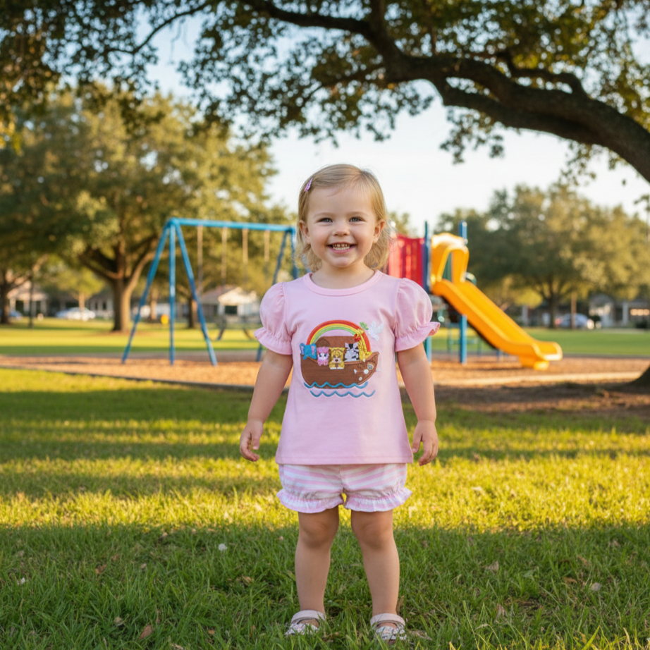 Bring the story of love, hope, and new beginnings to life with our Noah’s Ark Pink Baby Set. This delightful two-piece outfit features a soft pink puff-sleeve top adorned with an embroidered Noah’s Ark scene — complete with rainbow, dove, and pairs of playful animals sailing on calm waters.