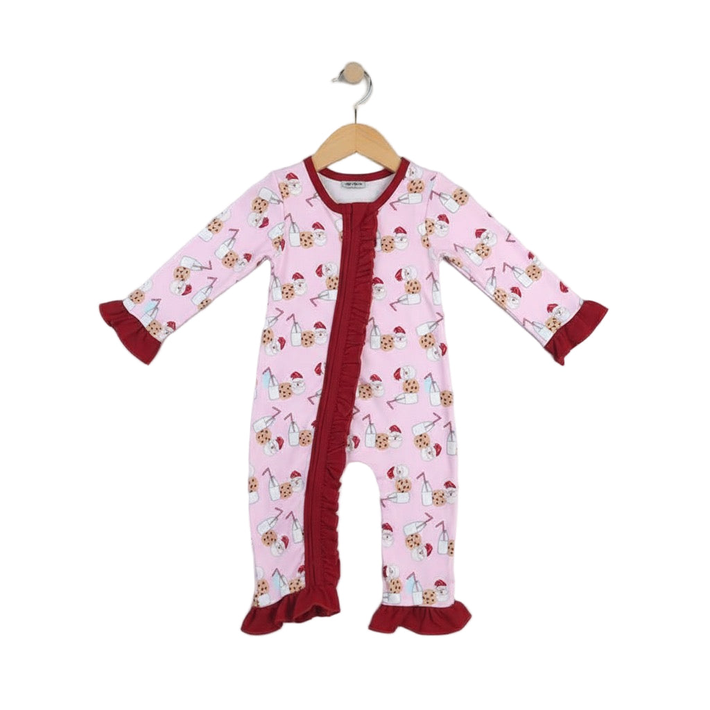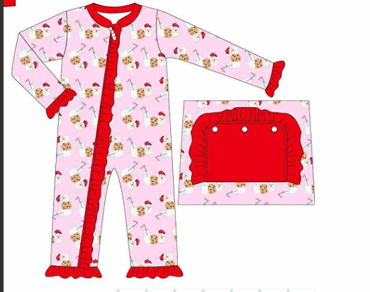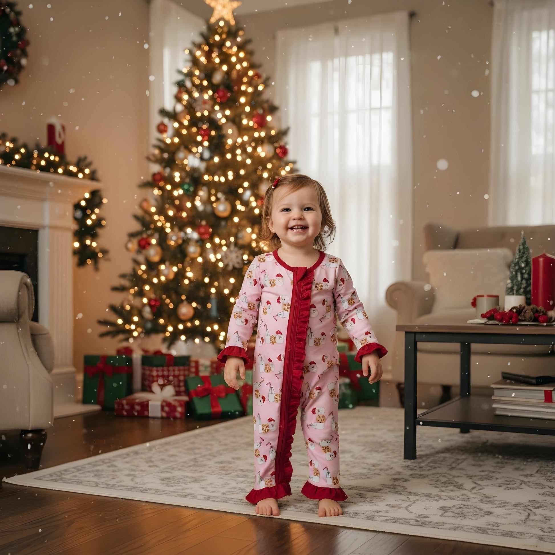 This adorable girls’ zippy is perfect for holiday fun and cozy nights! It features a playful print of gingerbread cookies and candy canes wearing Santa hats on a soft pink background. Designed with a ruffled front zipper, ruffle-trimmed cuffs, and a cute red ruffle butt flap detail, it’s both festive and sweet. Made of 95% cotton and 5% spandex, this zippy is soft, stretchy, and perfect for holiday photos, lounging, and seasonal celebrations.
