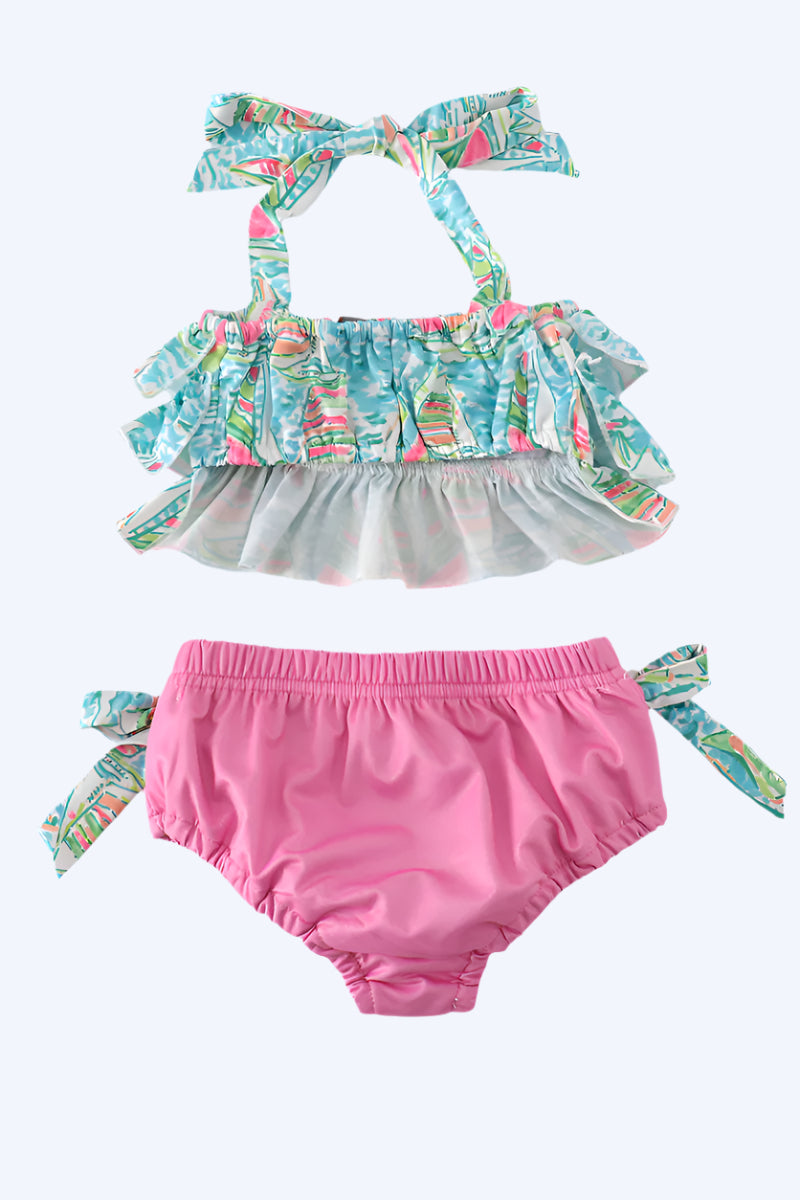 Make a splash with this playful two-piece swimsuit featuring a charming teal sailboat serenity print. Perfect for the little girl who loves to sail, this swimsuit offers both style and comfort for a day at the beach. Let her soak up the sun in style!