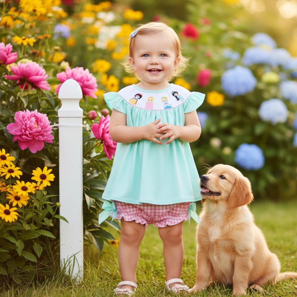 Make every day feel like a storybook adventure with our Princess Smocked Flutter Set! This adorable two-piece outfit features a soft aqua flutter-sleeve top with beautifully embroidered princesses across the smocked yoke — ready to inspire dreams, play, and twirls.